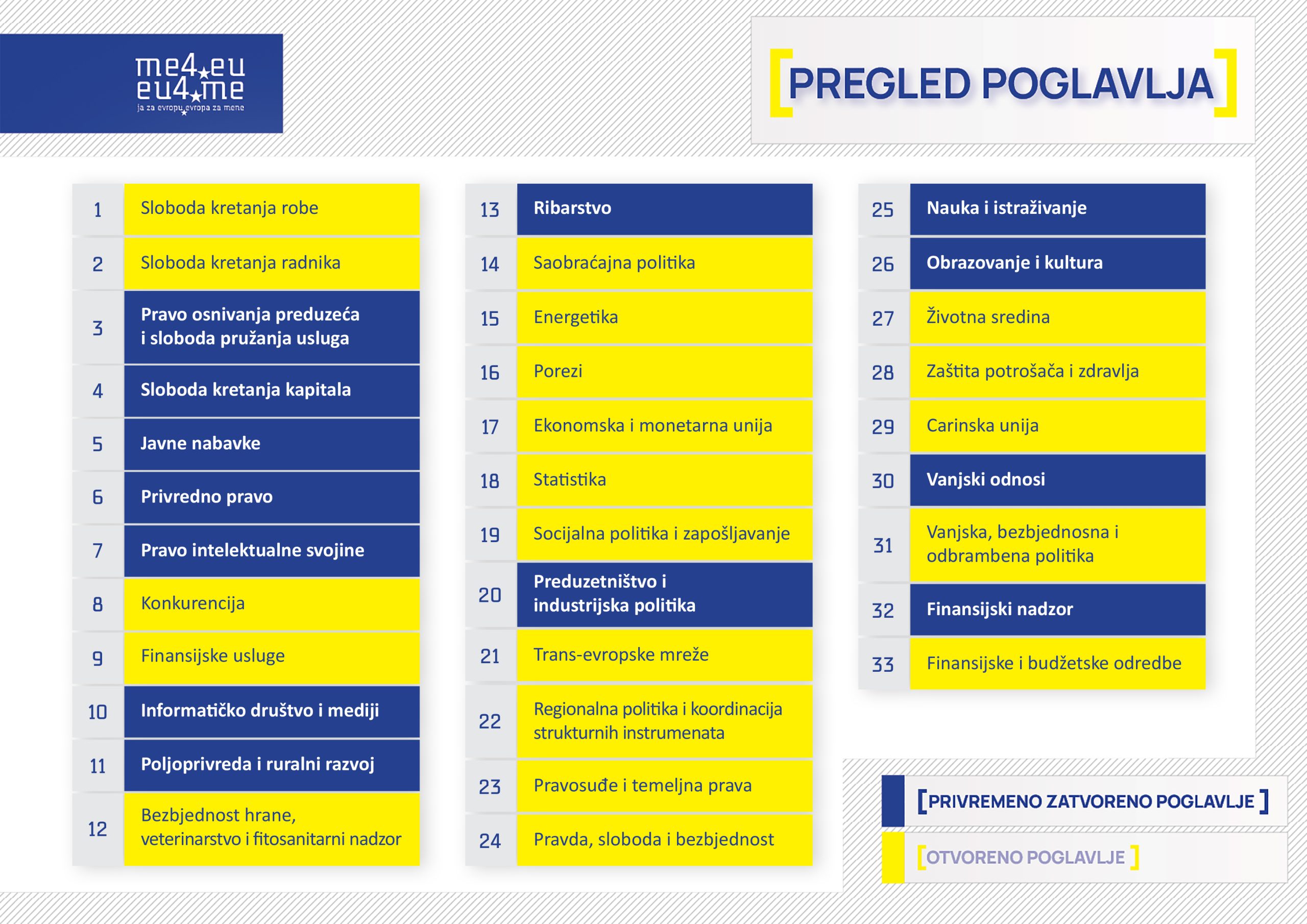 Zvanično otvorena pregovaračka poglavlja 5 – Javne nabavke, 6 – Privredno pravo, poglavlje 20 – Preduzetništvo i industrijska politika, 23 – Pravosuđe i temeljna prava, 24 – Pravda, sloboda i bezbjednost.