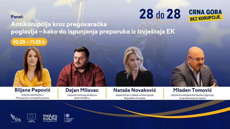Na panelu će govoriti državna sekretarka u Ministarstvu evropskih poslova Biljana Papović, zamjenik izvršnog direktora MANS-a Dejan Milovac, ekspertkinja iz oblasti antikorupcije iz Republike Hrvatske Nataša Novaković i zamjenik predsjednika Savjeta Agencije za sprečavanje korupcije Mladen Tomović.